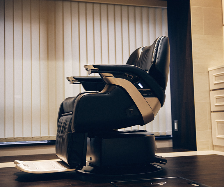 カットチェアには最高級のタカラベルモント社製「LEGENDⅡ」をご用意。本革シートにレッグレストヒーターやケープ内の熱こもりを防ぐ送風ファン、AC電源などを完備し、お客様の快適性を追求いたしました。